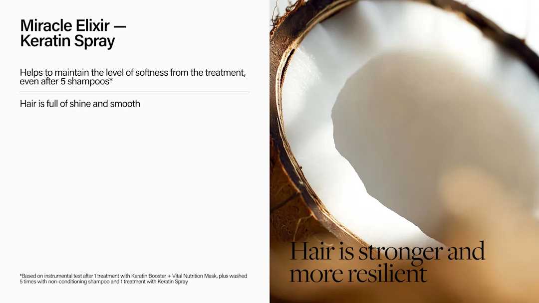 Mbroni flokët tuaj me Miracle Elixir Keratin Spray, një trajtim i lehtë pa shpëlarje, i krijuar për të zgjatur efektin e trajtimit Miracle Elixir Keratin Booster që bëhet në salon. Ruani forcën, butësinë dhe shkëlqimin. I pasuruar me keratinë bimore riparuese, ky spraj shumëfunksional ndihmon të rindërtojë fijet e dobësuara dhe mbron nga dëmtimet e përditshme.